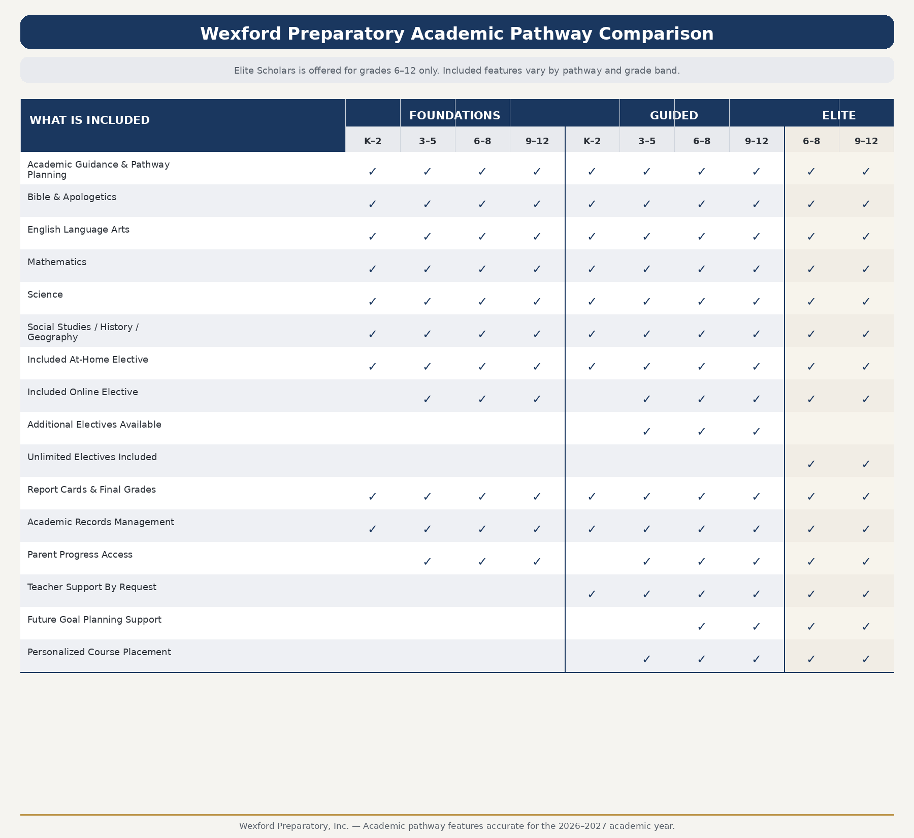 K-12 Families in the Homeschool Scholars pathway select and provide their own curriculum materials, while Wexford provides administrative support, academic recordkeeping, and organized documentation oversight.